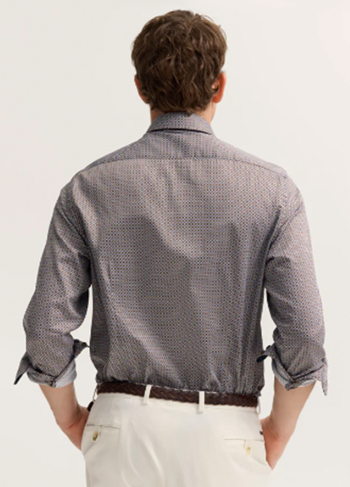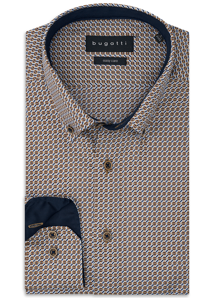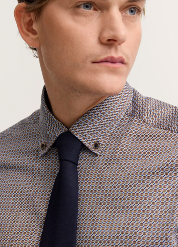 La chemise sophistiquée pur coton, finition satinée, coupe moderne, bleu et cognac