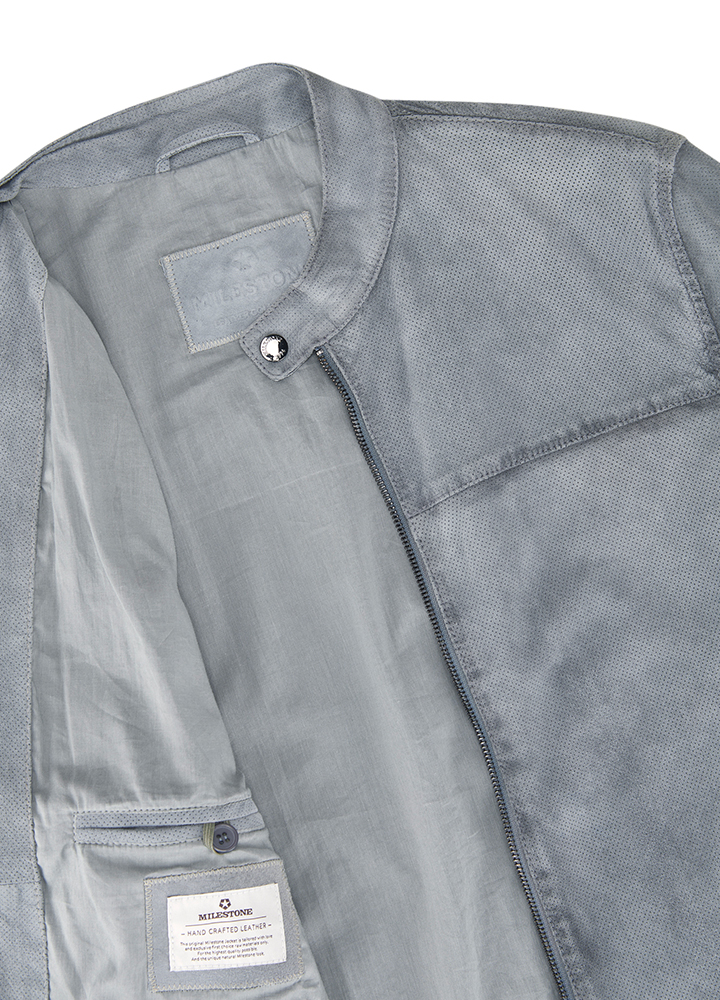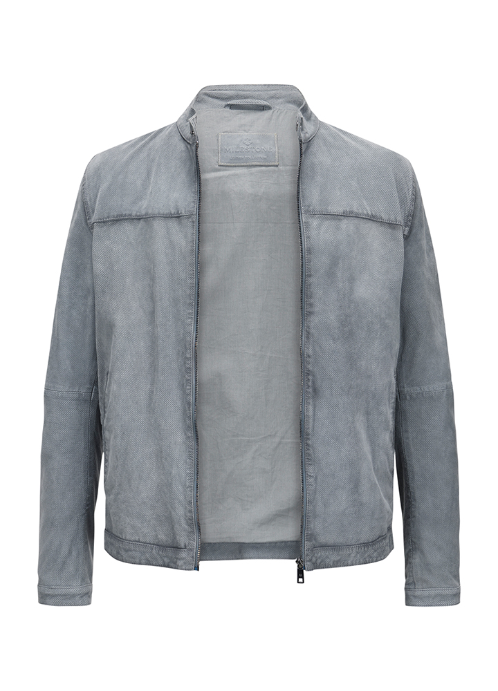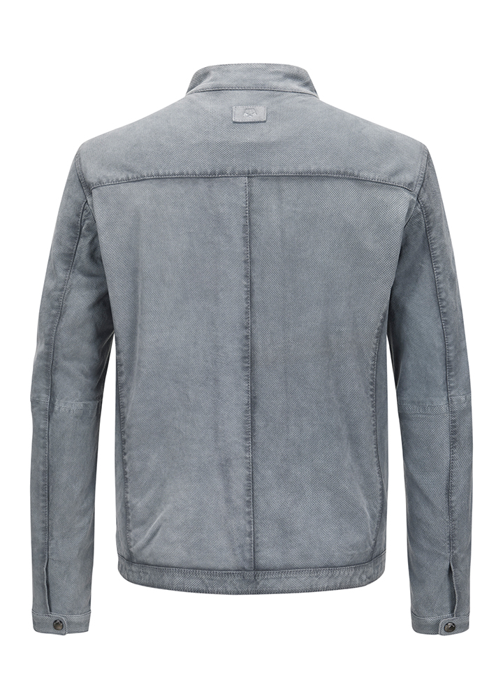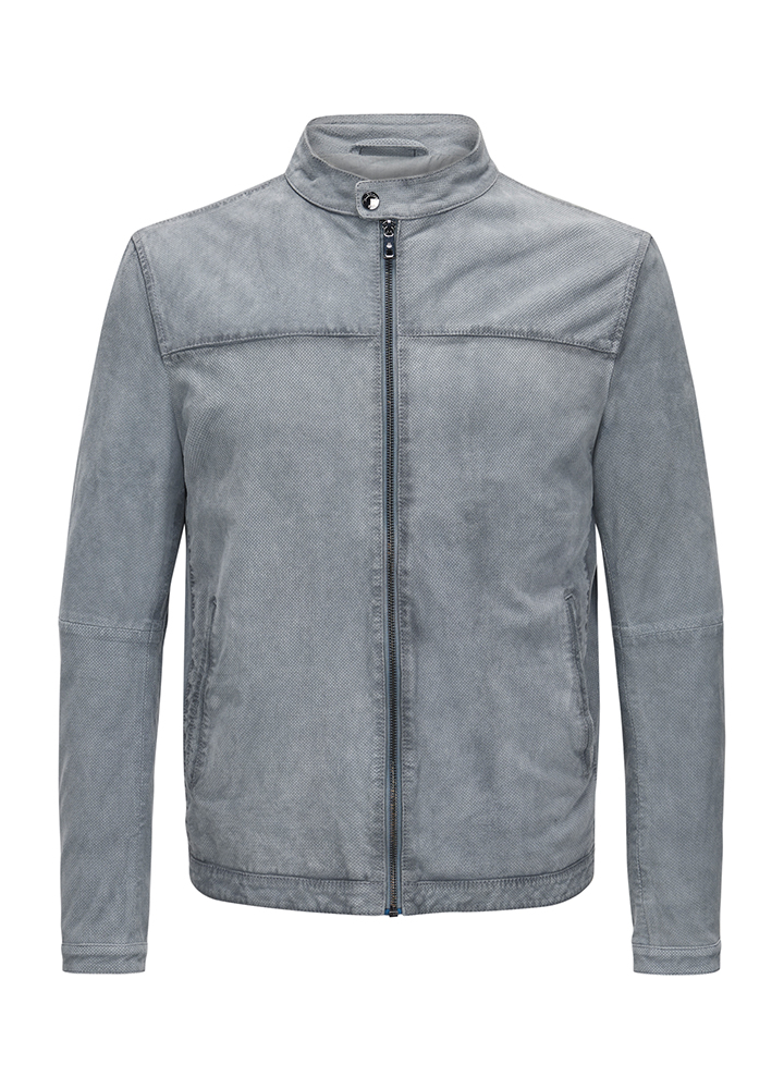 La veste distinctive en daim souple, effet subtil bicolore, ton bleu jeans