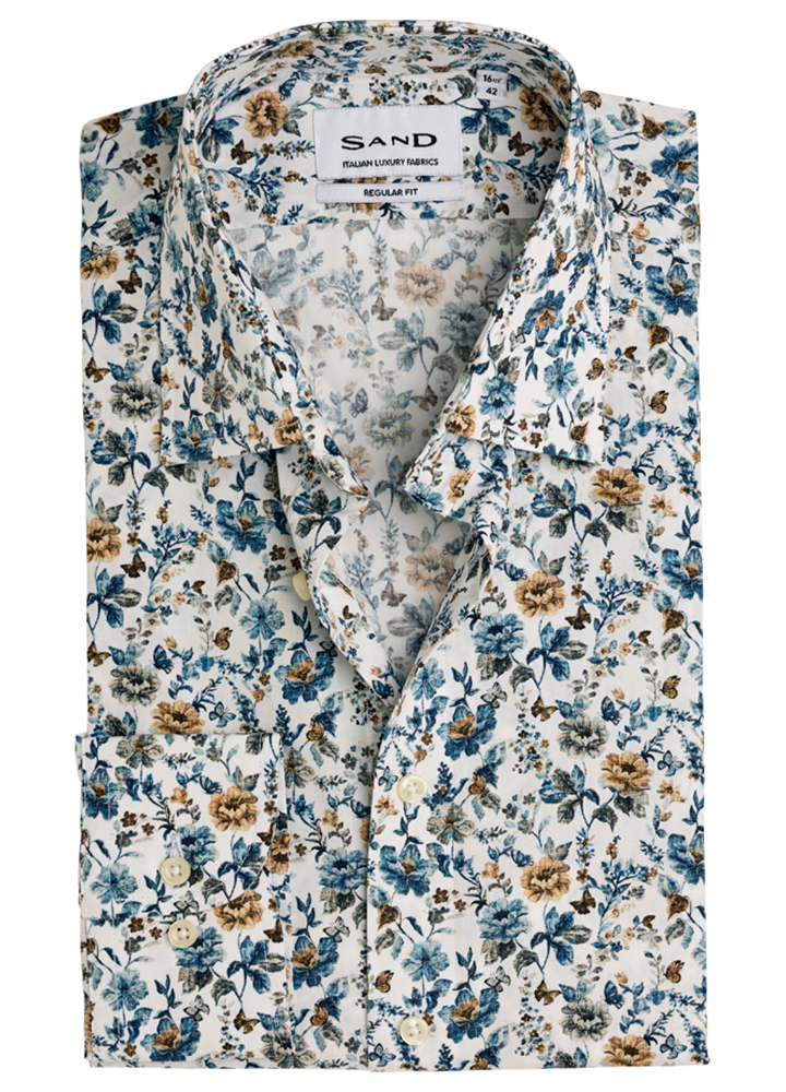 La chemise raffinée, imprimée d’un bouquet floral, doux textile italien